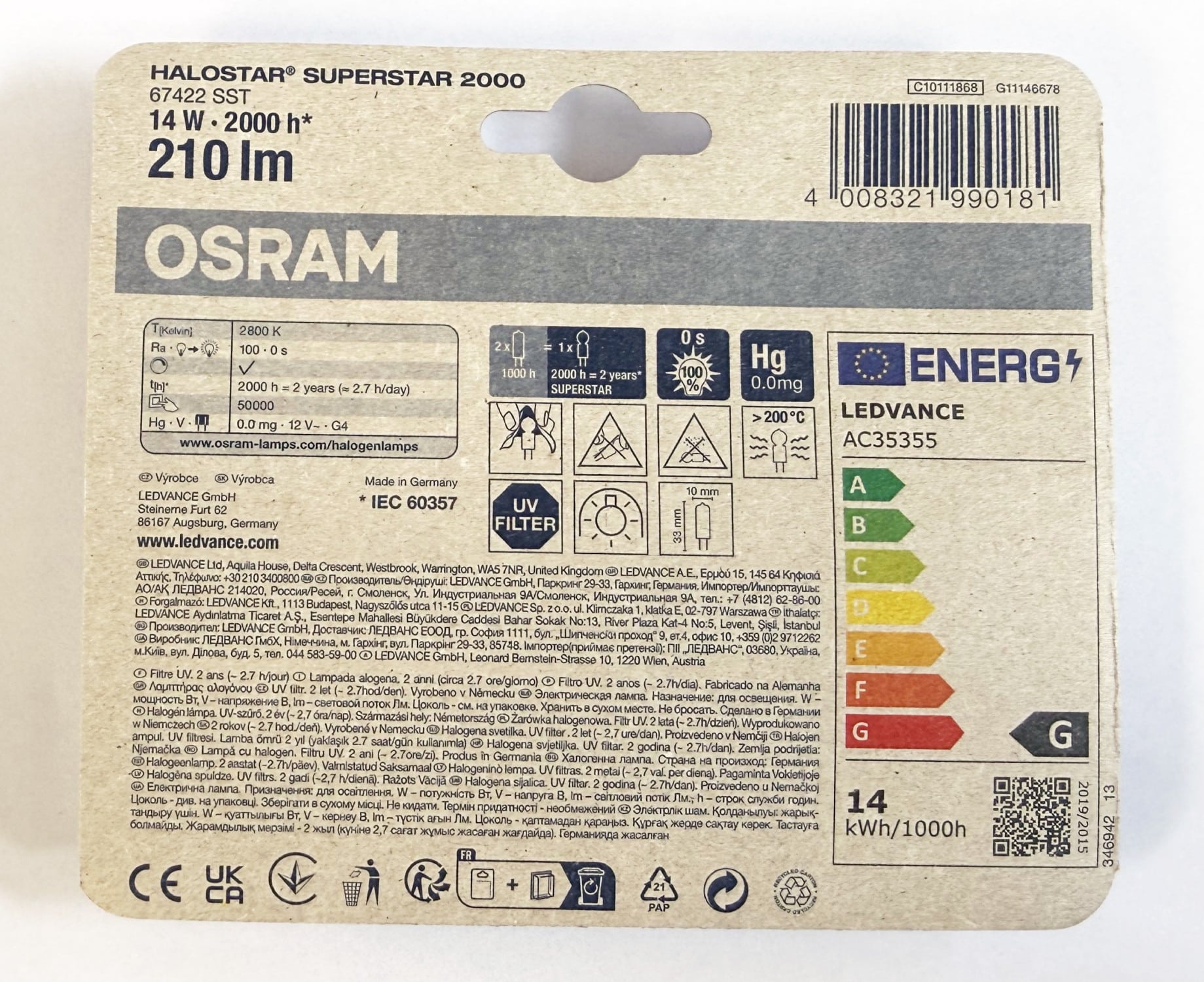 Keywords: 10er Pack, OSRAM Halostar Superstar 2000, G4, 12V Halogen, Stiftsockellampe, 14W, ersetzt 20W,