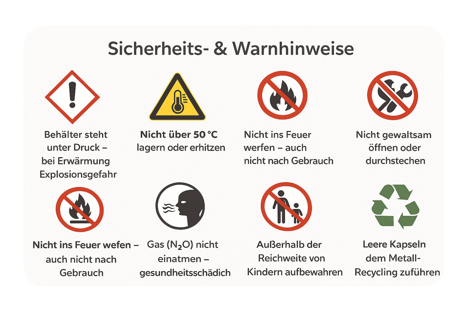 - Gasfüllung: ca. 8,4 g reines N2O pro Kapsel