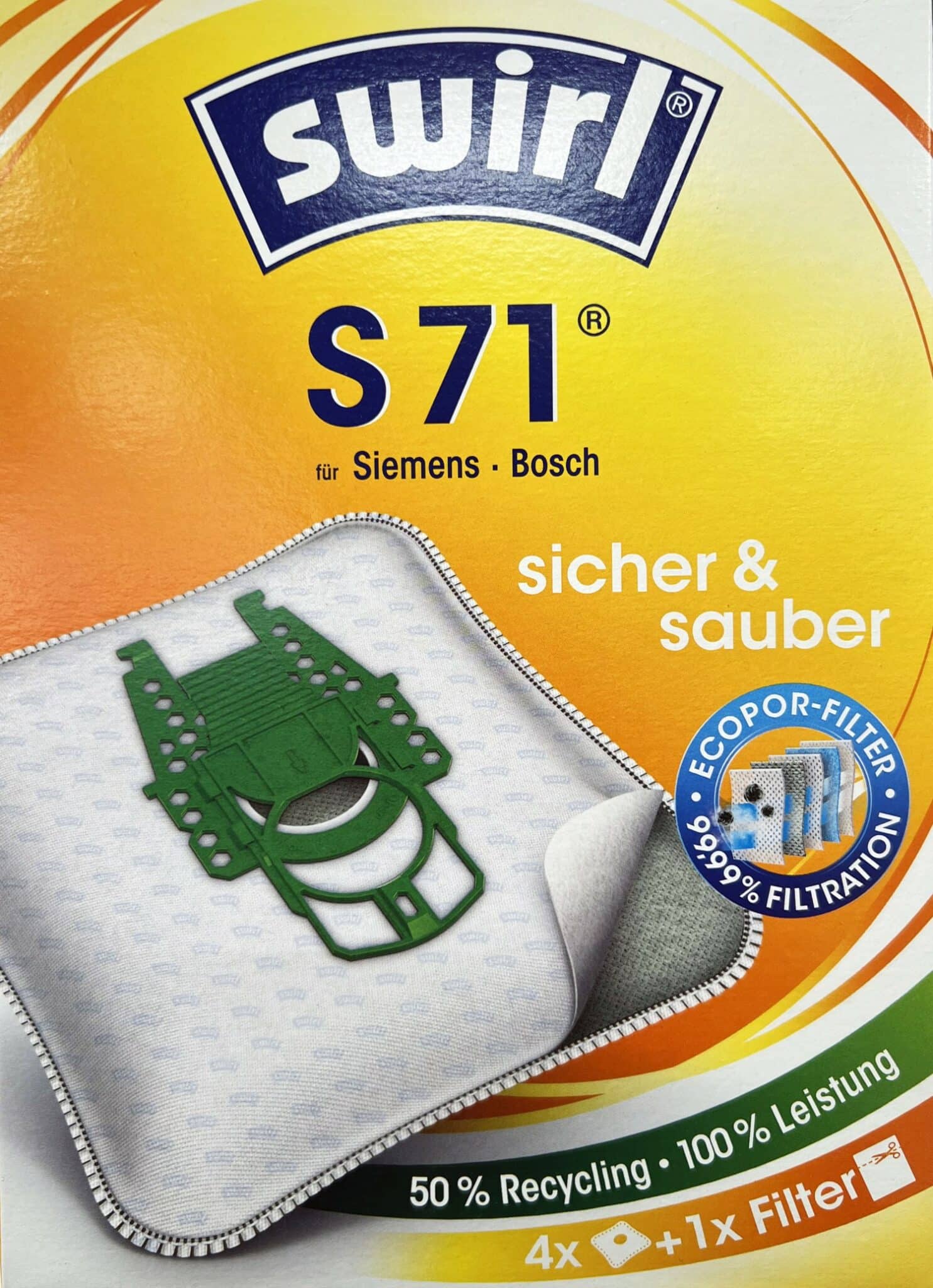 Swirl® Staubsaugerbeutel mit EcoPor Filter bestehen zu einem großen Teil aus Altpapier und Recycling-Kunst-stoff – umweltschonend bei 100 % Leistung!