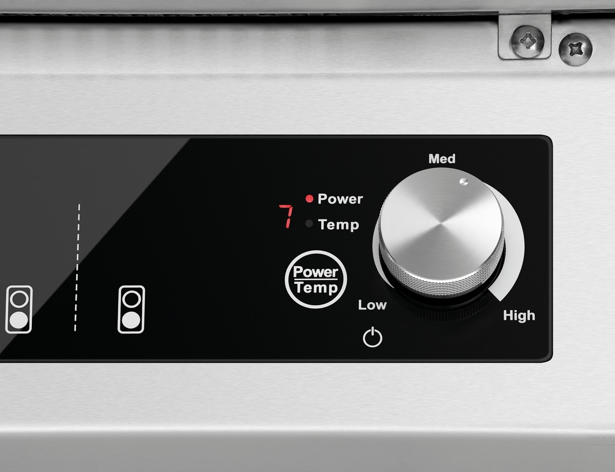 Regelung der Kochfelder wechselbar zwischen Leistungsstufen und Temperatur, Steuerung über Knebel, Touch