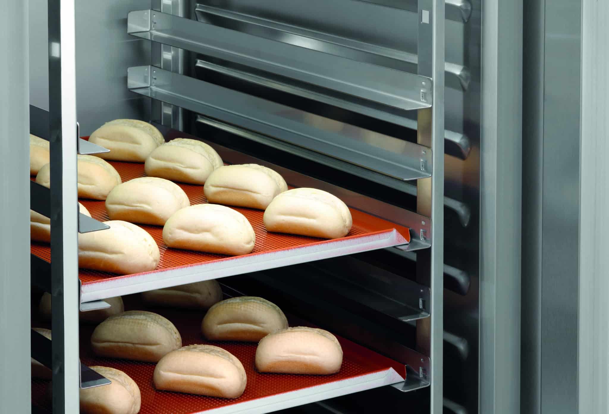 Kuchen und Torten, Brot und Brötchen vorproduzieren und bis zur Ausgabe oder Weiterverarbeitung auf dem passenden Blech fachgerecht tiefkühlen und bevorraten. Der Tiefkühlschrank im Bäckereinorm-Format schafft hierfür ausreichend Platz in Bäckereien, Konditoreien, Cafés sowie Hotelküchen.