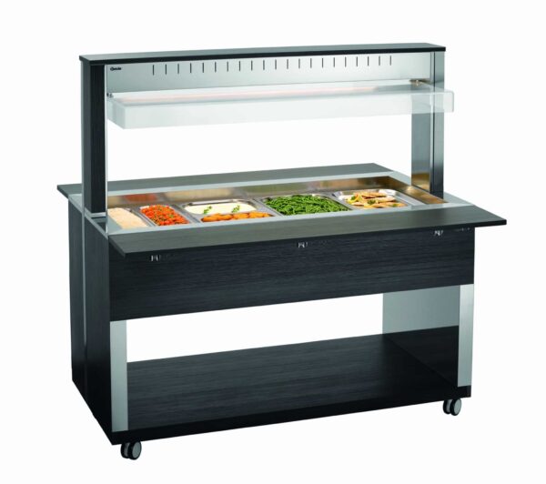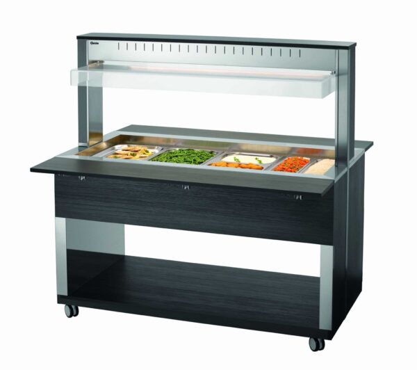 Die mobile Buffetlösung im modernen Holzdesign – Der Buffetwagen mit Hustenschutz und LED-Beleuchtung fasst 4 GN-Behälter 1/1 GN und hält mit dem Wasserbad-Prinzip Speisen schonend und ansprechend am Buffet warm.