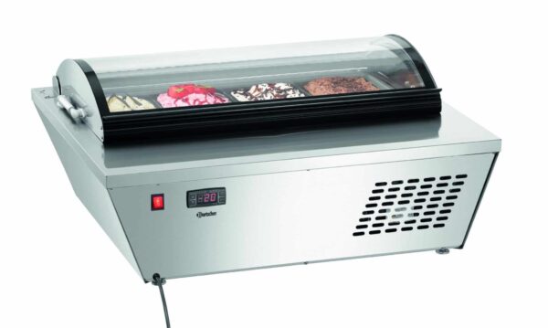 Für Ihre individuellen Eisspezialitäten – Mit den 4 herausnehmbaren Behältern à 6,5 Liter ist die Eisvitrine die kompakte, platzsparende Lösung für die Dessert-Zubereitung in allen Gastronomieküchen.