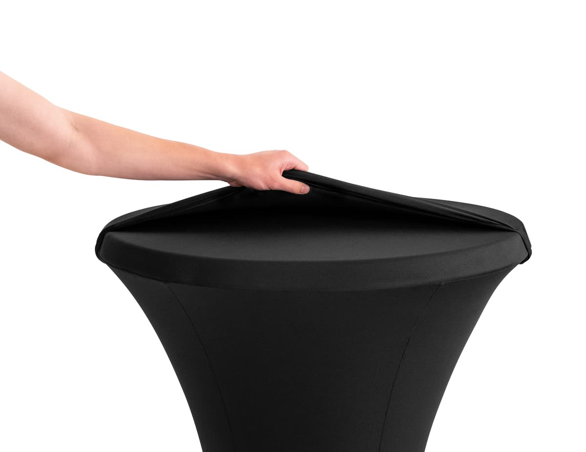 Der schwarze Ersatz-Schonbezug ermöglicht ein schnelles und unkompliziertes Wechseln des Schonbezuges aus dem Stehtisch-Hussen-Set 700 S – auch während der Veranstaltung.