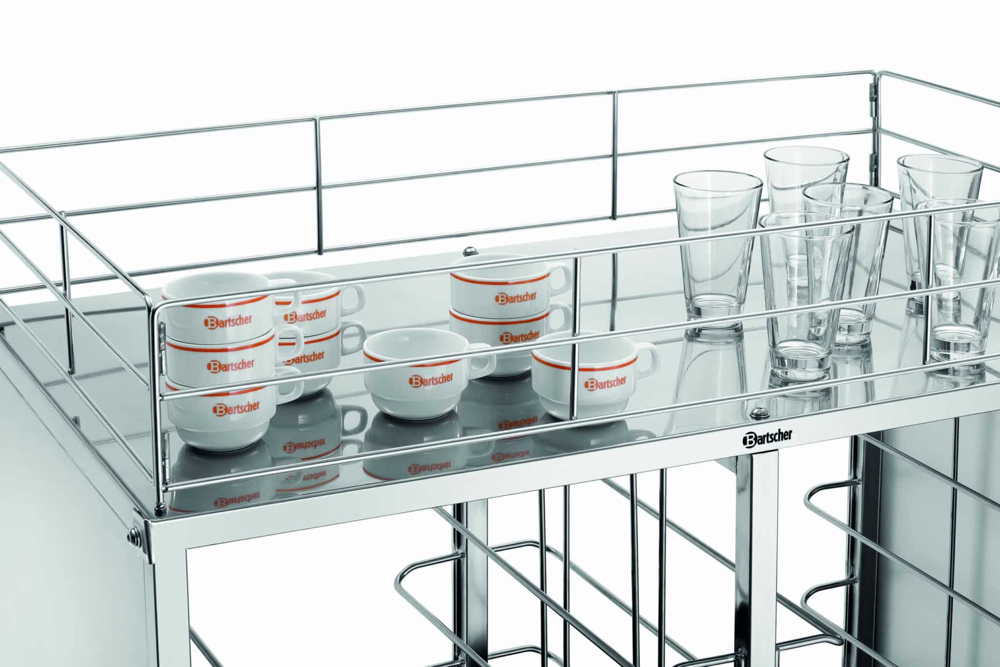 Transportwagen mit praktischer Abstellfläche – Die 20 Einschübe können sowohl zum Abräumen von Tabletts als auch zum Transport von GN-Behältern genutzt werden.