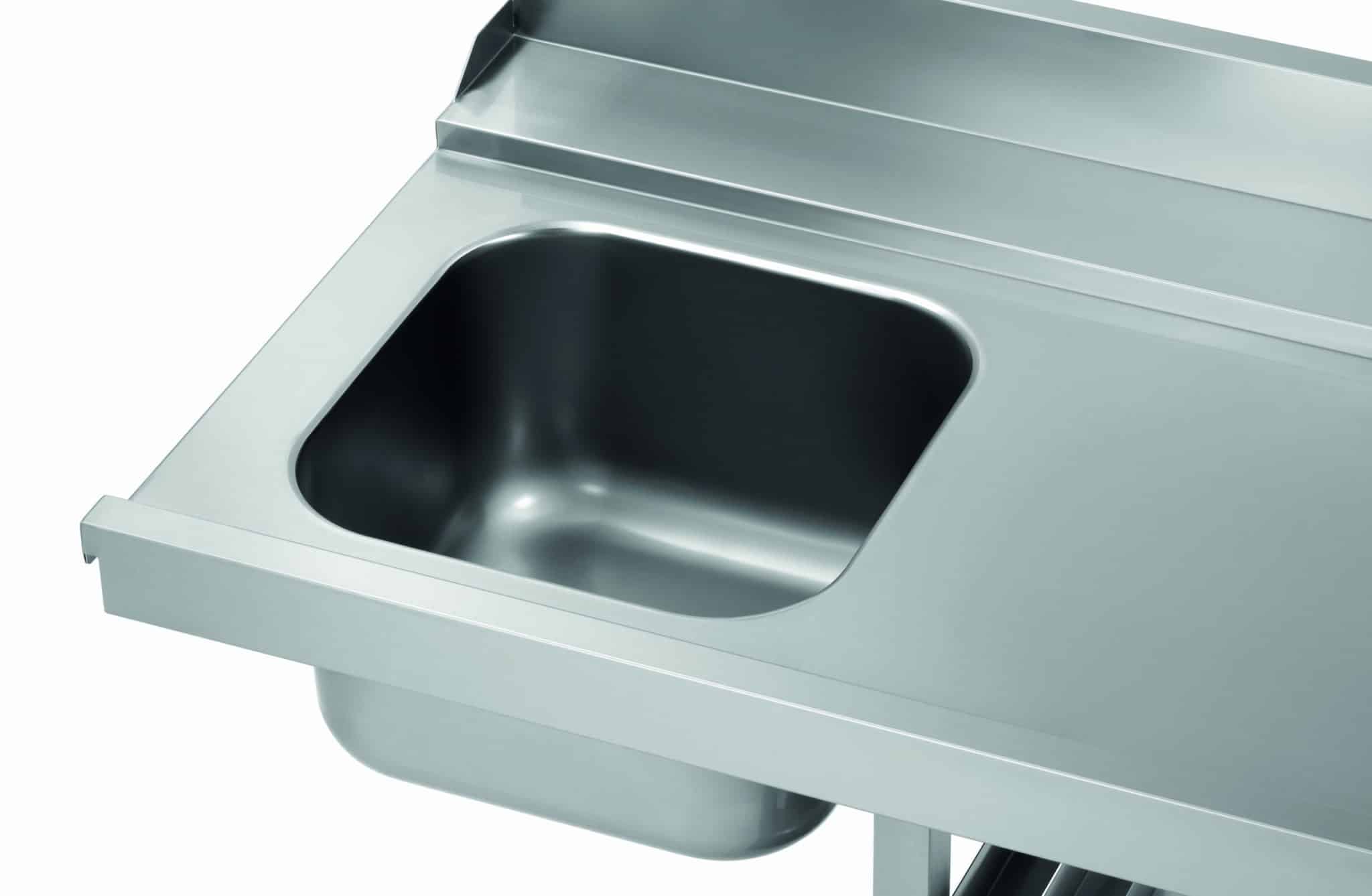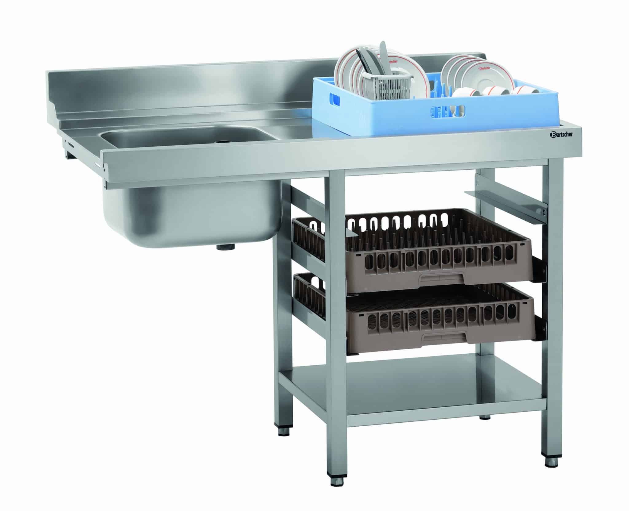 Die zu den Durchschubspülmaschinen DS passende Vorabräumung ist mit einem 40 Liter Spülbecken ausgestattet und ausgelegt für den rechtsseitgen Anbau. In den 3 praktischen Spülkorbeinschüben können 500x500er und 600x500er Körbe mit einer Höhe von bis zu 145 mm verstaut werden.