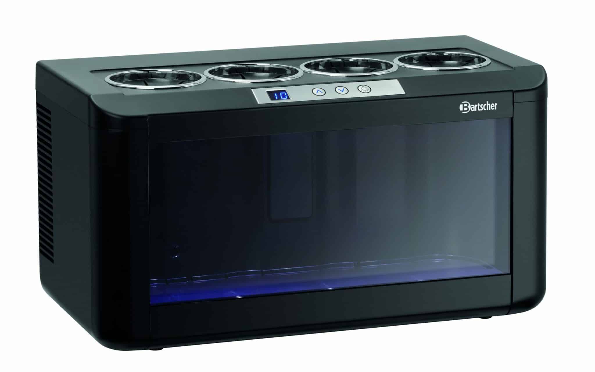 Platzsparender Weinkühler mit LED-Beleuchtung im eleganten Design. 4 Flaschen Weiß-, Rosé- oder Rotwein können innerhalb einer Temperaturzone im Offenausschank wie am Buffet, an der Bar oder beim Wein-Tasting repräsentativ kühl gehalten werden.
