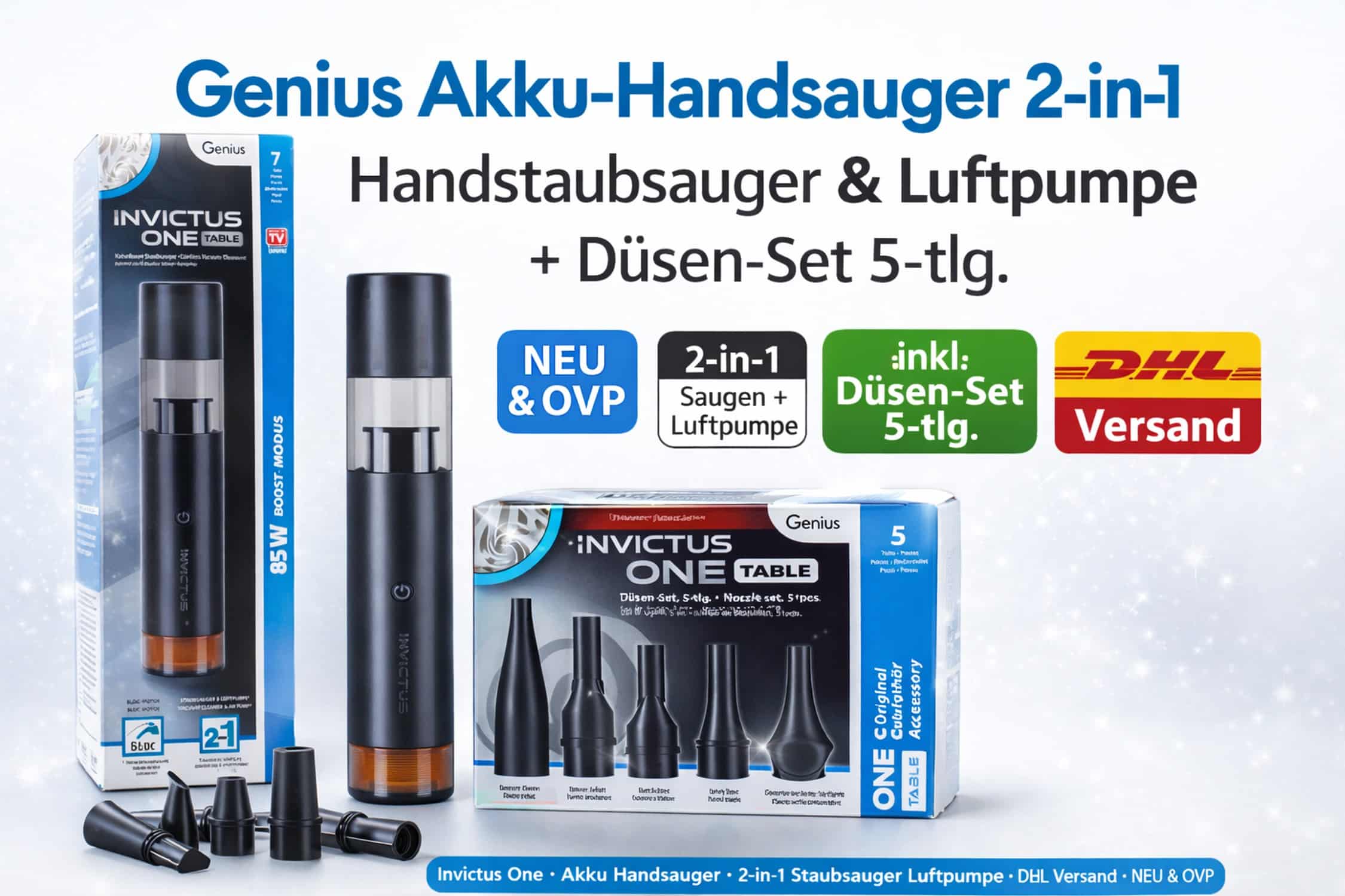 - 1x Genius Akku-Handsauger 2-in-1 (Handstaubsauger & Luftpumpe)