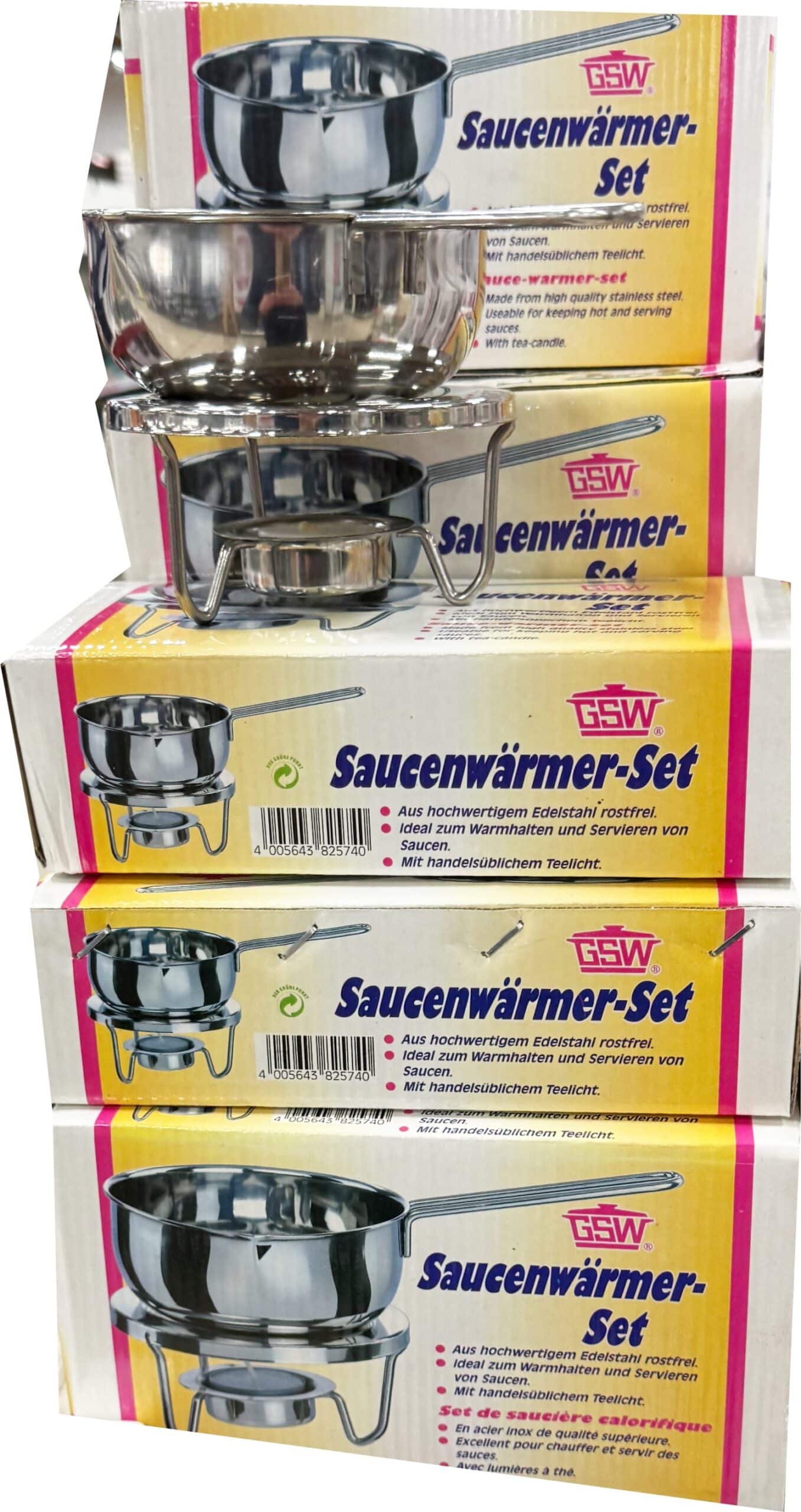 Erleben Sie die elegante Funktionalität des GSW Saucenwärmer Sets, bestehend aus einem hochwertigen Edelstahlgehäuse in stilvollem Silber/Chrom-Finish. Dieses runde Butterpfänchen-Set ist ideal für die schonende Erwärmung von Saucen und bietet eine praktische Teelicht-Wärmequelle, um Ihre Gerichte auf subtile Weise zu verfeinern. NEU und mit der Herstellernummer 2522/4 versehen, vereint dieses Set Design und Qualität für den anspruchsvollen Haushalt.