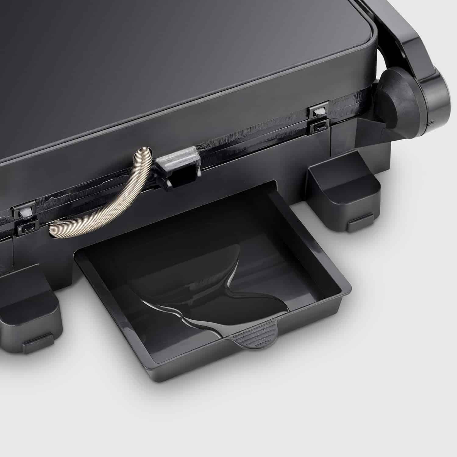 Die integrierte Abtropfschale sorgt für eine saubere, fettarme Zubereitung. Die abnehmbaren Keramikplatten lassen sich leicht reinigen und garantieren hygienischen Grillspaß.