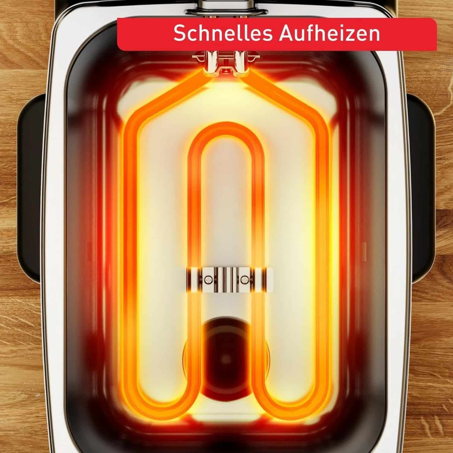 - Frei im Frittierfett liegendes Heizelement für schnelles Vorheizen und effiziente Temperaturregulierung